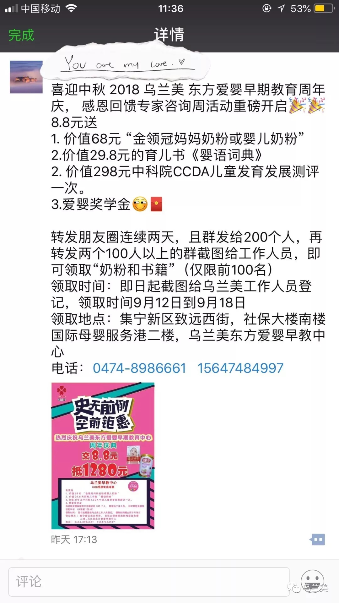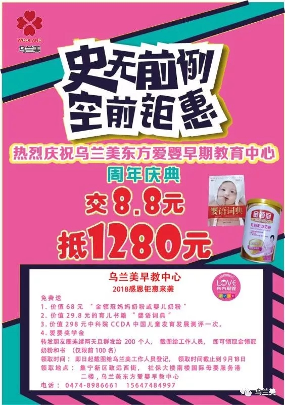 領取時間:即日起截圖給烏蘭美•東方愛嬰早教中心工作人員登記,領取時間截止到2018年9月19日。