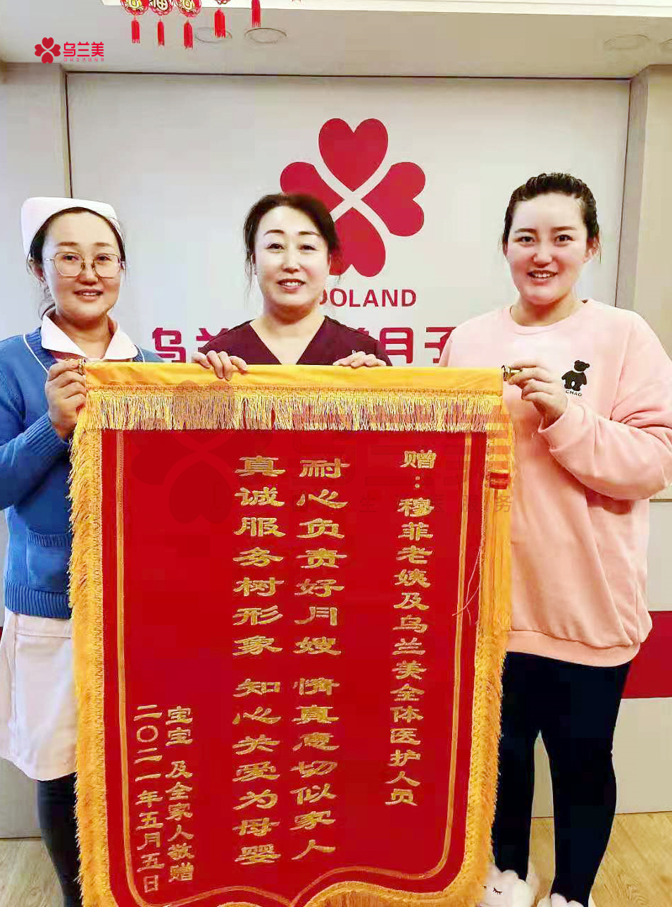 5月5日一大早,烏蘭美醫養月子中心的每一位母嬰護理師和工作人員的臉上,都洋溢著幸福的笑容??蛻粼S娜一家將一面印有“耐心負責好月嫂,情真意切似家人,真誠服務樹形象,知心關愛為母嬰”的錦旗,親自送到了烏蘭美醫養月子中心母嬰護理師穆菲(簡稱,穆姐)手里,以此感謝她對寶媽和寶寶無微不至的關懷與照護,并對烏蘭美健康集團的正規和專業表示了認可!