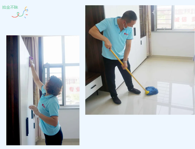 △烏蘭美康養院的生活助理團隊正在為李恩國爺爺打掃房間衛生