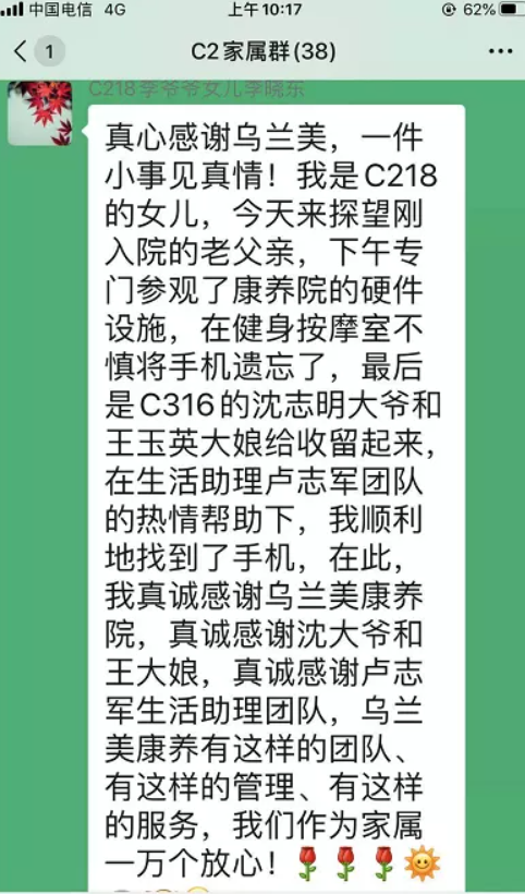 “說實話,剛開始的時候我對烏蘭美康養院抱有試試看的心態。因為之前父親在其他老養院入住,效果很不好,我作為子女很心疼。不過,現在我對烏蘭美康養院是一萬個放心!不單單是因為大家幫助我找尋手機,更多的是這里優質的服務。全部都是細節,特別周到。”