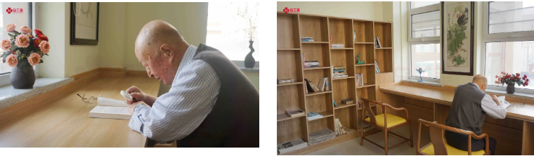 在烏蘭美康養院的圖書室里,人們常常會看到一位老人拿著放大鏡在埋頭讀書,一讀就是2小時。談及爺爺的閱讀愛好,老人家興奮地說:“我每天早上起來,在康養院內散散步。九點左右就去康復訓練室里用按摩椅活動活動筋骨,九點半左右我就去圖書室了,一般看兩小時的書。每天中午和晚上睡覺前,我是一定要看一小時書的,這已經成為了生活‘必需品’。”不少人感嘆王爺爺的自律,他卻打趣道:“我也是勞逸結合!午睡后,我會到活動室打兩小時的麻將。”