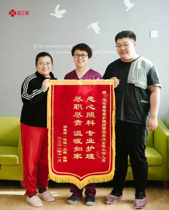 2021年11月即將滿一個月的月子生活,讓依依寶寶的媽媽難以忘懷,她親身體會到了烏蘭美醫養月子中心母嬰護理師曹麗英無微不至的關懷和照顧,感受了每一位工作人員飽滿的工作熱情。在寶寶滿月這天,特地給烏蘭美醫養月子中心準備了禮物——一面寫著“悉心照料,專業護理,盡職盡責,溫暖如家”的感謝錦旗,錦旗充分表達了寶媽及家屬對烏蘭美醫養月子中心所有工作人員及母嬰護理師曹麗英深切的感激之情。