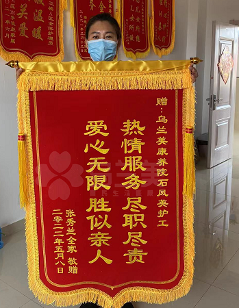 近日,烏蘭美康養院收到了一封致謝院內全體工作人員的感謝信和一面送給石鳳英護理員的錦旗,錦旗上面寫著“熱心服務,盡職盡責,愛心無限,勝似親人”。一句感謝的話語,一面肯定的錦旗都承載了老人家屬對我們服務的認可,讓我們更有一種責任感和使命感要把這份工作做好。