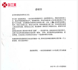 隨著錦旗一起送進來的還有一封致謝烏蘭美康養院全體工作人員的感謝信,來信人是在康養院入住的張秀蘭奶奶的子女,他們在信中感謝工作人員對張奶奶的悉心呵護、專業照顧、辛勤付出和陪伴,更稱贊康養院為所有的老人提供了一個幸福溫暖的大家庭,最后祝愿康養院的明天更加輝煌。