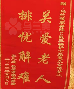 這面錦旗是楊緒清爺爺老兩口專門送給烏蘭美康養院C區三樓護士孟惠蓉的,之前楊緒清爺爺和老伴兒入住在孟惠蓉所在區域C區單間,相處的非常好,后來由于爺爺有糖尿病想住套間自己做飯吃,因此老兩口搬到了D區居住,到了D區孟惠蓉依然放心不下爺爺,相處過程中,孟惠蓉早就把爺爺當作自己的親人,時不時跑到爺爺房間詢問他的病情,陪他聊天,這讓楊爺爺十分感動。